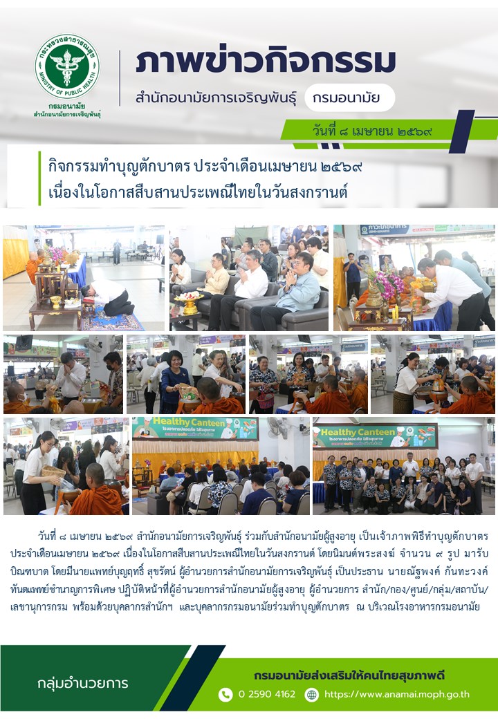 วันที่ 8 เมษายน 2569 สำนักอนามัยการเจริญพันธุ์ ร่วมกับสำนักอนามัยผู้สูงอายุ เป็นเจ้าภาพพิธีทำบุญตักบาตรประจำเดือนเมษายน 2569 เนื่องในโอกาสสืบสานประเพณีไทยในวันสงกรานต์ โดยนิมนต์พระสงฆ์ จำนวน 9 รูป มารับบิณฑบาต โดยมีนายแพทย์บุญฤทธิ์ สุขรัตน์ ผู้อำนวยการสำนักอนามัยการเจริญพันธุ์ เป็นประธาน นายณัฐพงค์ กันทะวงค์ ทันตแพทย์ชำนาญการพิเศษ ปฏิบัติหน้าที่ผู้อำนวยการสำนักอนามัยผู้สูงอายุ ผู้อำนวยการ สำนัก/กอง/ศูนย์/กลุ่ม/สถาบัน/เลขานุการกรม พร้อมด้วยบุคลากรสำนักฯ และบุคลากรกรมอนามัยร่วมทำบุญตักบาตร ณ บริเวณโรงอาหารกรมอนามัย