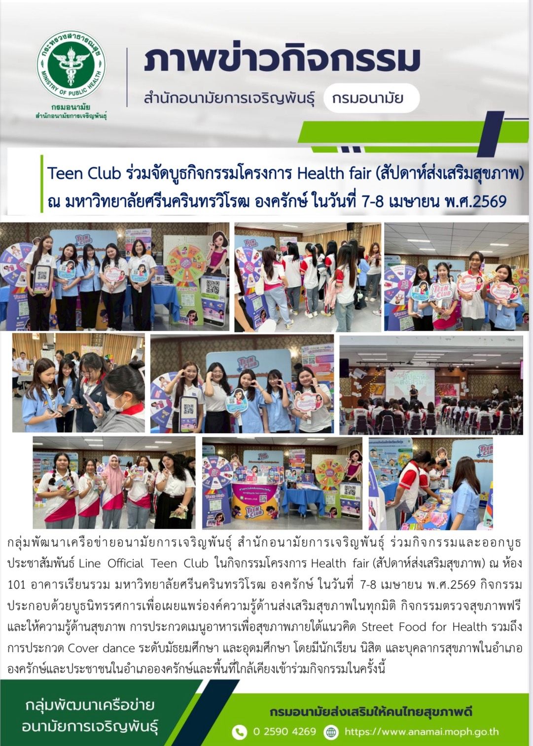 กลุ่มพัฒนาเครือข่ายอนามัยการเจริญพันธุ์ สำนักอนามัยการเจริญพันธุ์ ร่วมกิจกรรมและออกบูธประชาสัมพันธ์ Line Official Teen Club ในกิจกรรมโครงการ Health fair (สัปดาห์ส่งเสริมสุขภาพ) ณ ห้อง 101 อาคารเรียนรวม มหาวิทยาลัยศรีนครินทรวิโรฒ องครักษ์ ในวันที่ 7-8 เมษายน พ.ศ.2569 กิจกรรมประกอบด้วยบูธนิทรรศการเพื่อเผยแพร่องค์ความรู้ด้านส่งเสริมสุขภาพในทุกมิติ กิจกรรมตรวจสุขภาพฟรีและให้ความรู้ด้านสุขภาพ การประกวดเมนูอาหารเพื่อสุขภาพภายใต้แนวคิด Street Food for Health รวมถึงการประกวด Cover dance ระดัมัธยมศึกษา และอุดมศึกษา โดยมีนักเรียน นิสิต และบุคลากรสุขภาพในอำเภอองครักษ์และประชาชนในอำเภออองครักษ์และพื้นที่ใกล้เคียงเข้าร่วมกิจกรรมในครั้งนี้