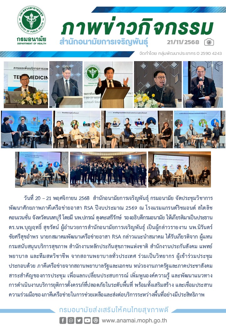 วันที่ 20 – 21 พฤศจิกายน 2568 สำนักอนามัยการเจริญพันธุ์ กรมอนามัย จัดประชุมวิชาการพัฒนาศักยภาพภาคีเครือข่ายอาสา RSA ปีงบประมาณ 2569 ณ โรงแรมแกรนด์ริชมอนด์ สไตลิช คอนเวนชั่น จังหวัดนนทบุรี โดยมี นพ.ปกรณ์ ตุงคะเสรีรักษ์ รองอธิบดีกรมอนามัย ให้เกียรติมาเป็นประธาน ดร.นพ.บุญฤทธิ์ สุขรัตน์ ผู้อำนวยการสำนักอนามัยการเจริญพันธุ์ เป็นผู้กล่าวรายงาน นพ.นิรันดร์ ชัยศรีสุขอำพร นายกสมาคมพัฒนาเครือข่ายอาสา RSA กล่าวแนะนำสมาคม ได้รับเกียรติจาก ผู้แทนกรมสนับสนุนบริการสุขภาพ สำนักงานหลักประกันสุขภาพแห่งชาติ สำนักงานประกันสังคม แพทย์ พยาบาล และทีมสหวิชาชีพ จากสถานพยาบาลทั่วประเทศ ร่วมเป็นวิทยากร ผู้เข้าร่วมประชุมประกอบด้วย ภาคีเครือข่ายจากสถานพยาบาลรัฐและเอกชน หน่วยงานภาครัฐและภาคประชาสังคม สาระสำคัญของการประชุม เพื่อแลกเปลี่ยนประสบการณ์ เพิ่มพูนองค์ความรู้ และพัฒนาแนวทางการดำเนินงานบริการยุติการตั้งครรภ์ที่ปลอดภัยในระดับพื้นที่ พร้อมทั้งเสริมสร้าง และเชื่อมประสานความร่วมมือของภาคีเครือข่ายในการช่วยเหลือและส่งต่อบริการระหว่างพื้นที่อย่างมีประสิทธิภาพ